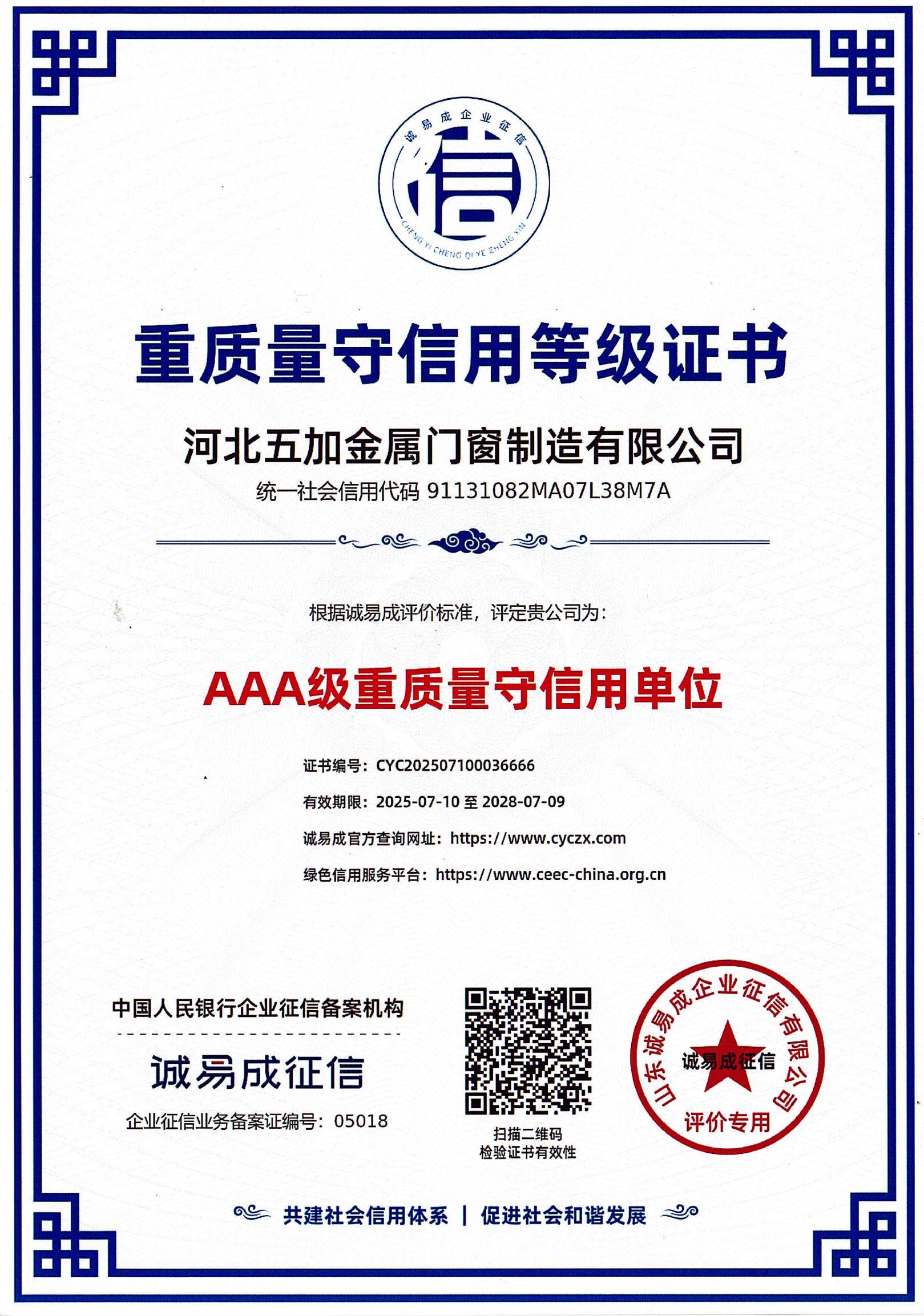 重质量守信用AAA级证书